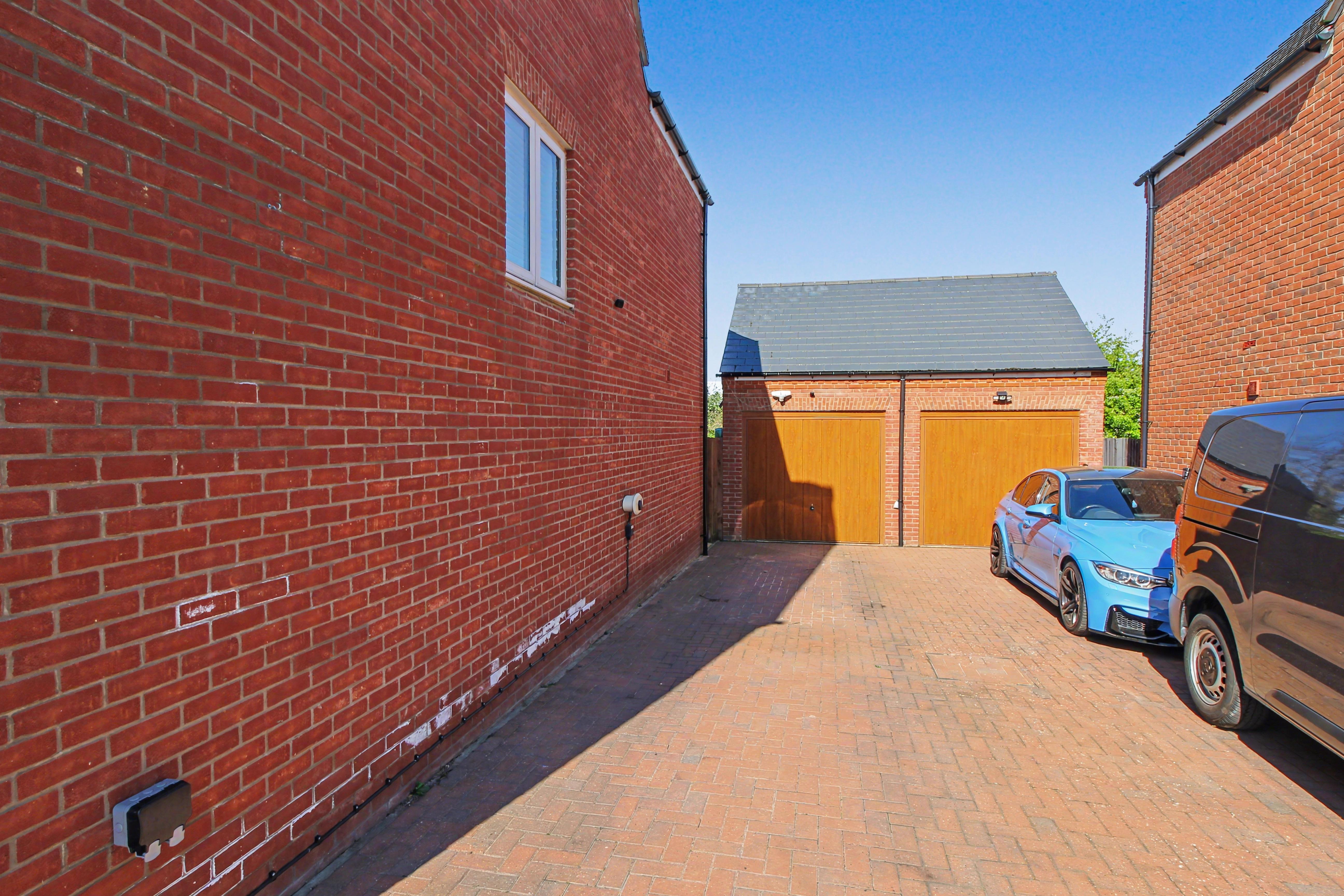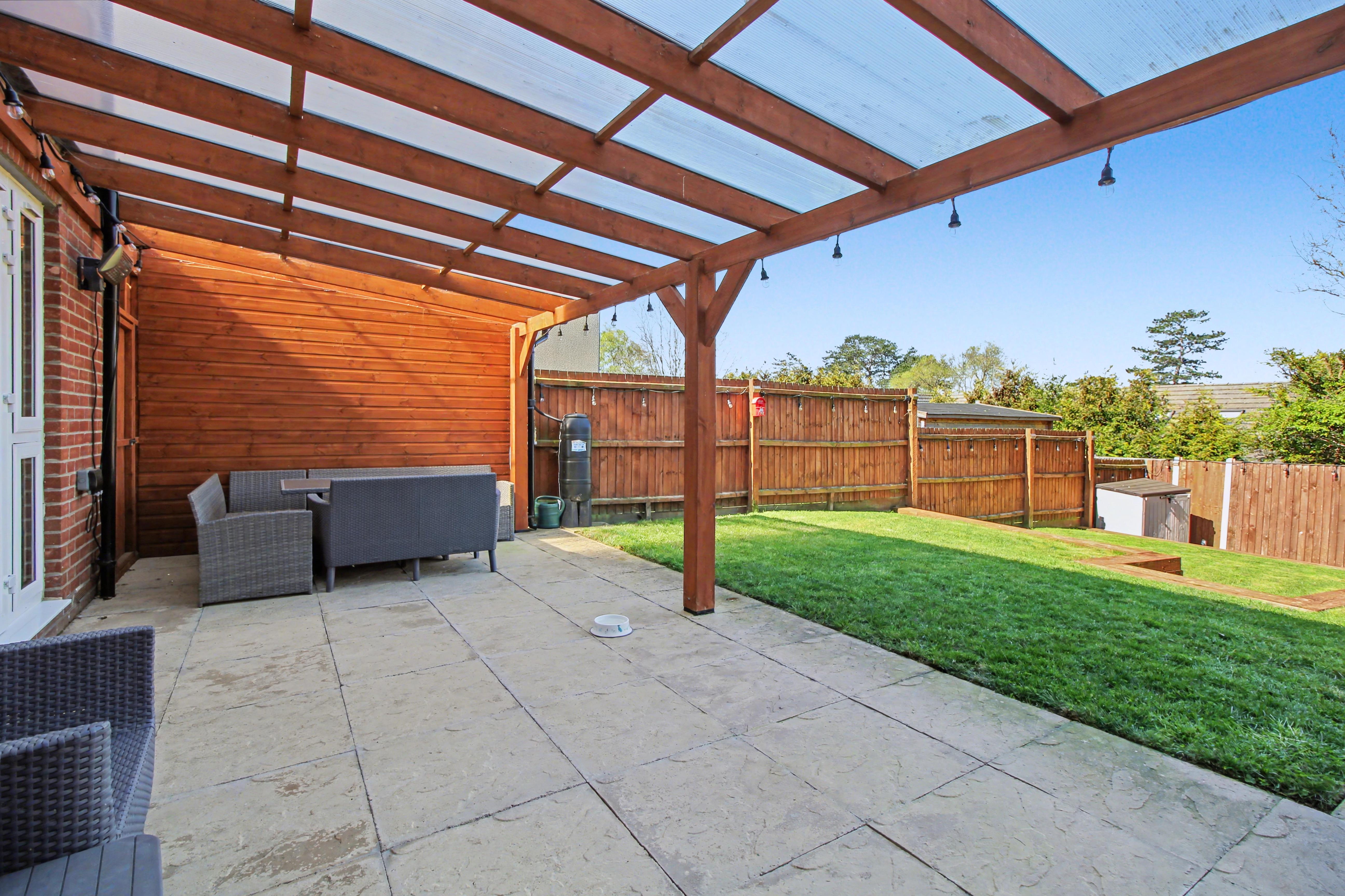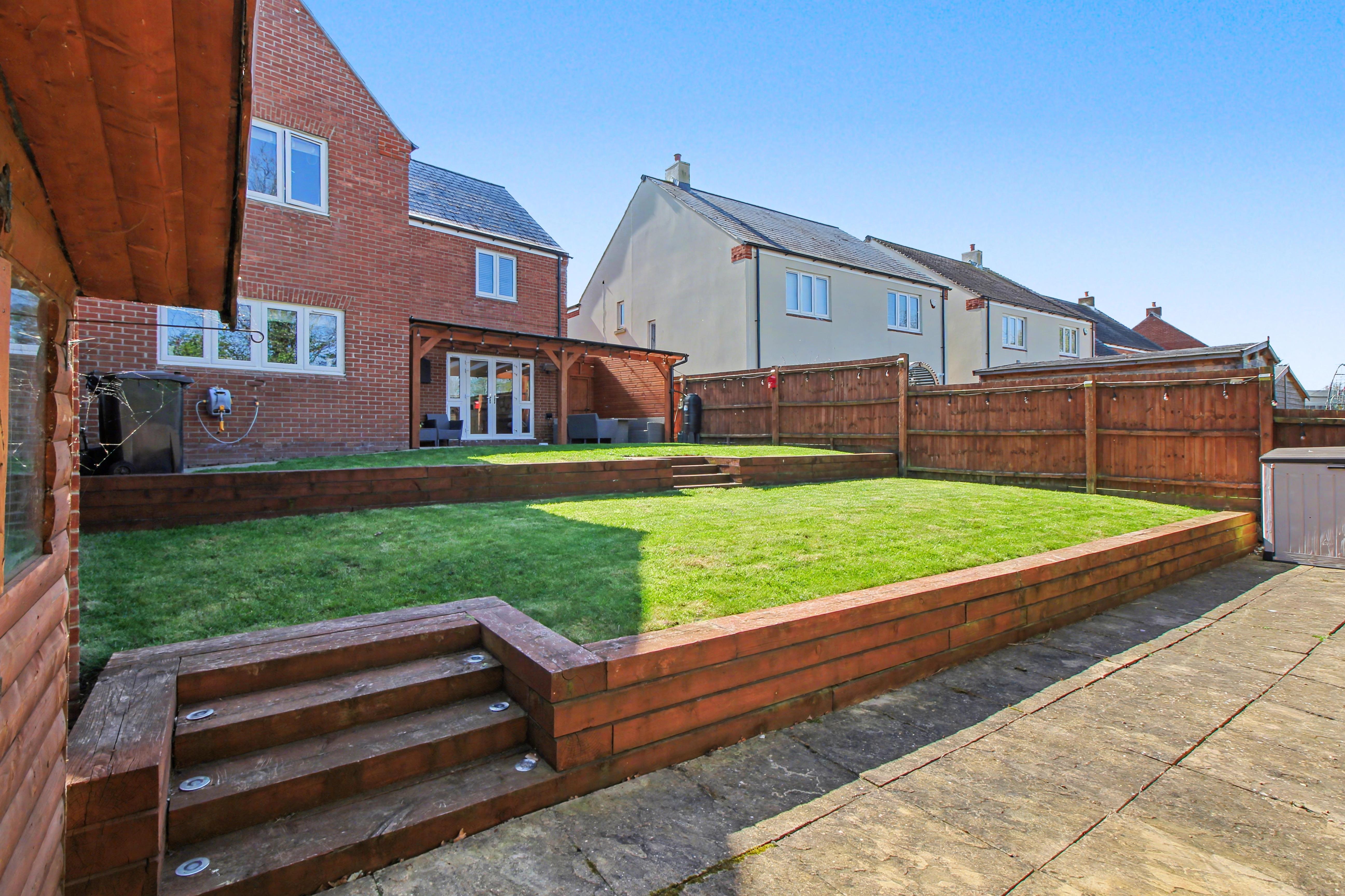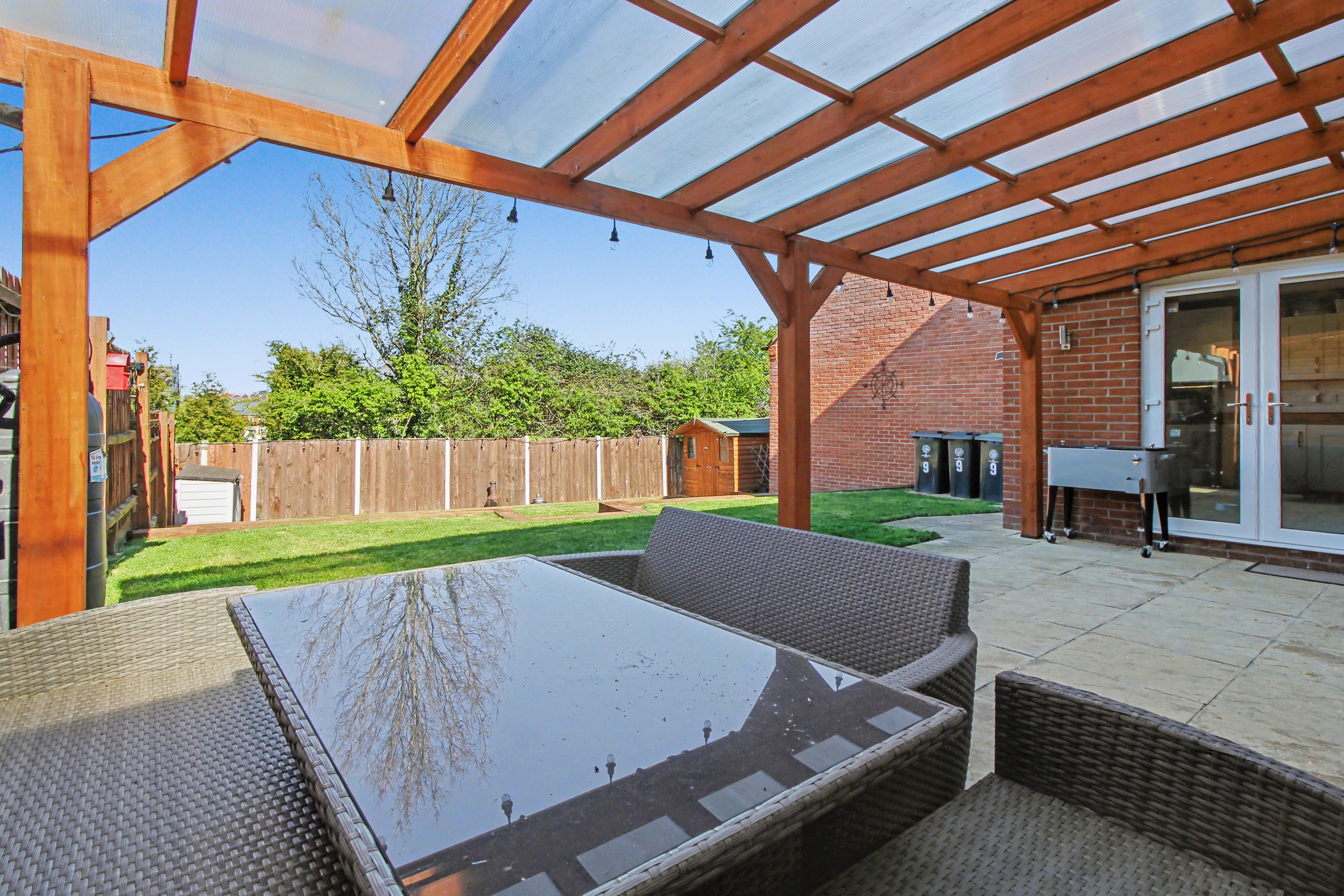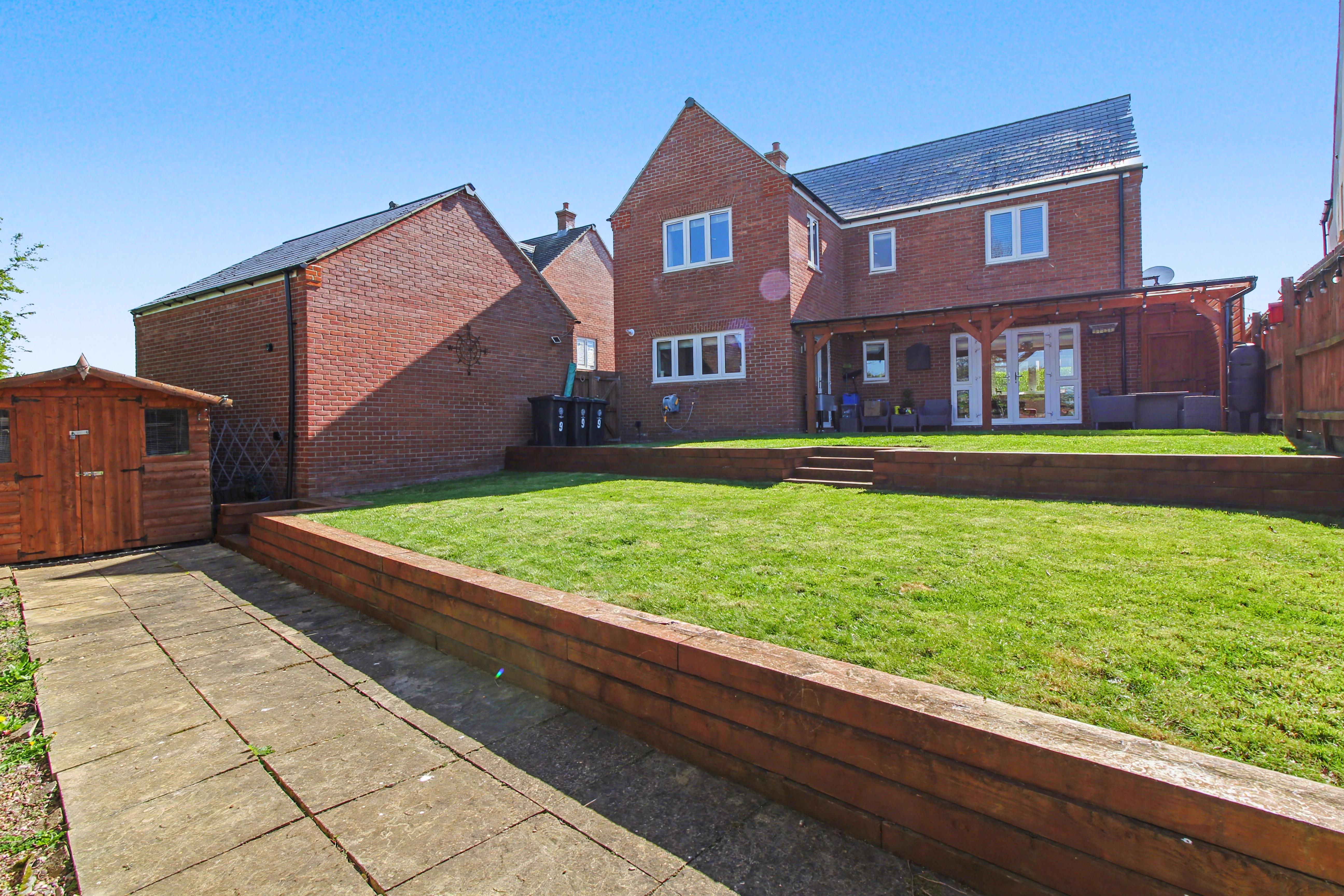 Externally, the property continues to impress with a beautifully landscaped three-tier rear garden. The upper tier features a patio seating area with pergola, leading onto a laid lawn, while the lower levels provide further garden space and an additional patio area, along with a garden shed. To the front, there is a large driveway, single garage, and further block-paved parking added by the current owners, creating excellent off-road parking provision.