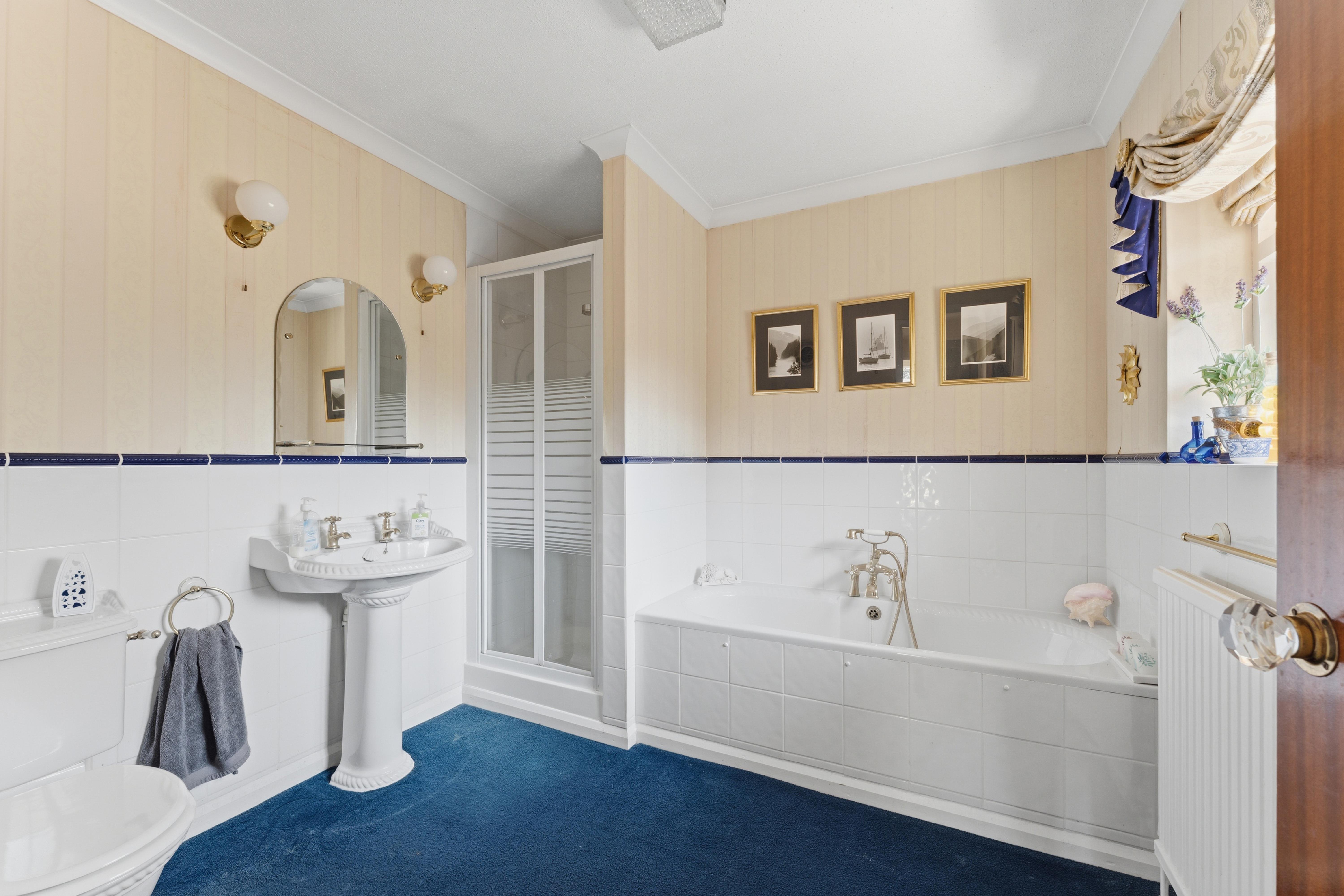 A second hall provides access to all four bedrooms. The sizeable main bedroom benefits from built-in wardrobes and is served by a four-piece bathroom suite featuring a sunken bath and a separate shower cubicle. The three other bedrooms are all well-proportioned doubles, and a family bathroom suite ensures convenience for the whole household.