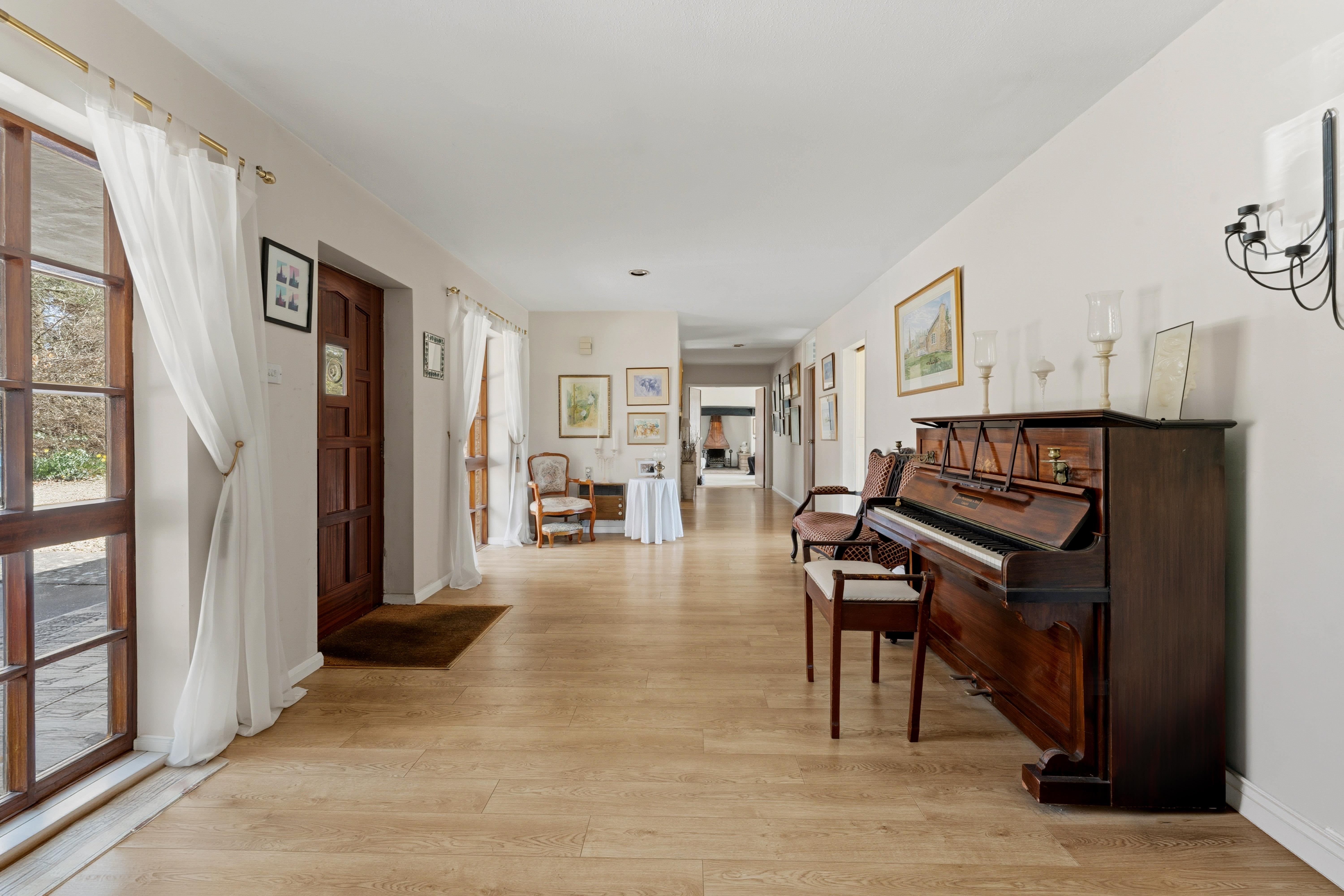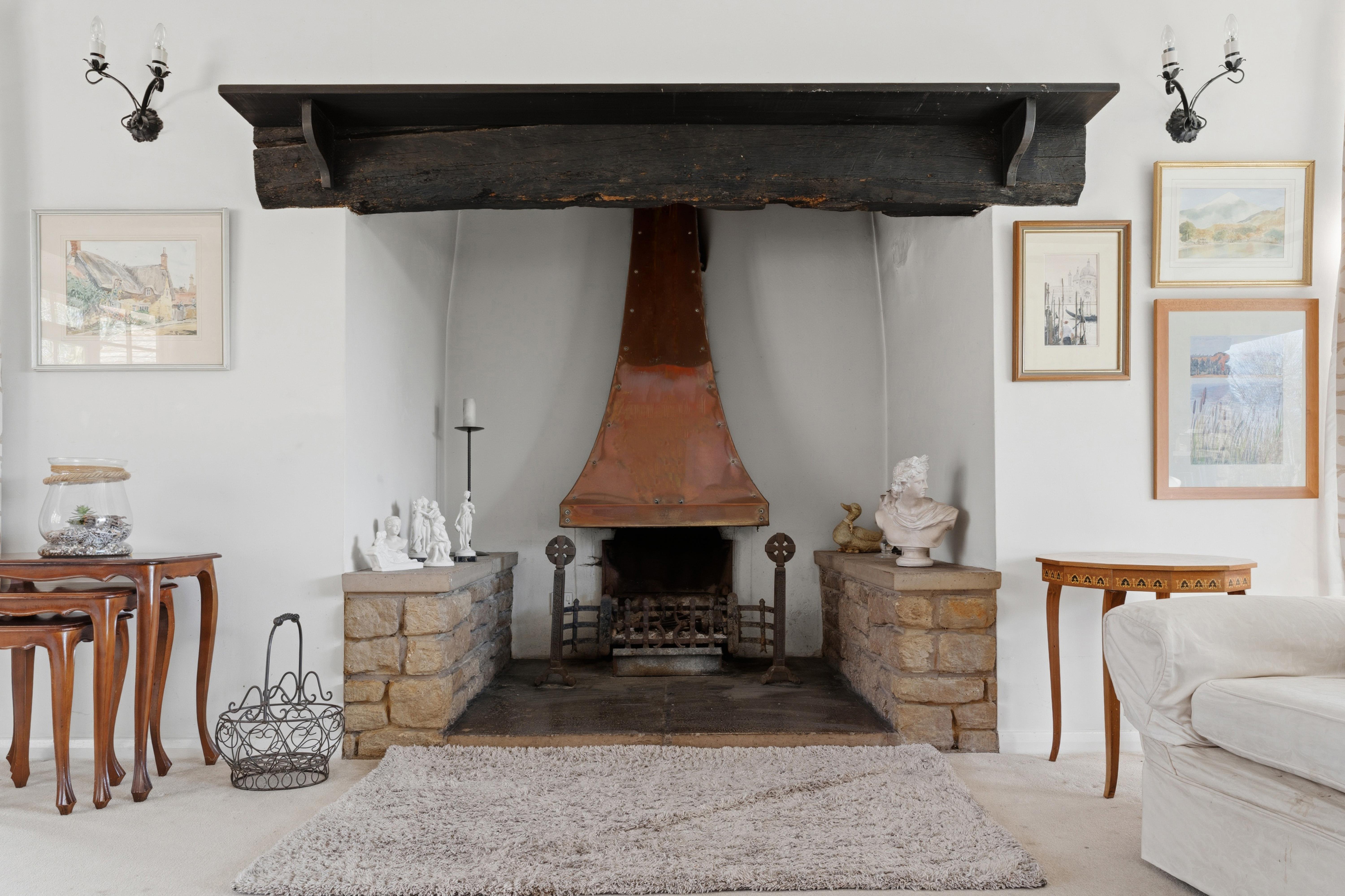 Inside, the spacious accommodation begins with a large and welcoming central reception hall, which sets the tone for the rest of the home. The inviting dual-aspect lounge features an inglenook style fireplace complete with a working open fire, perfect for cosy evenings, while sliding doors open onto a large outdoor dining area, perfect for summer barbeques.