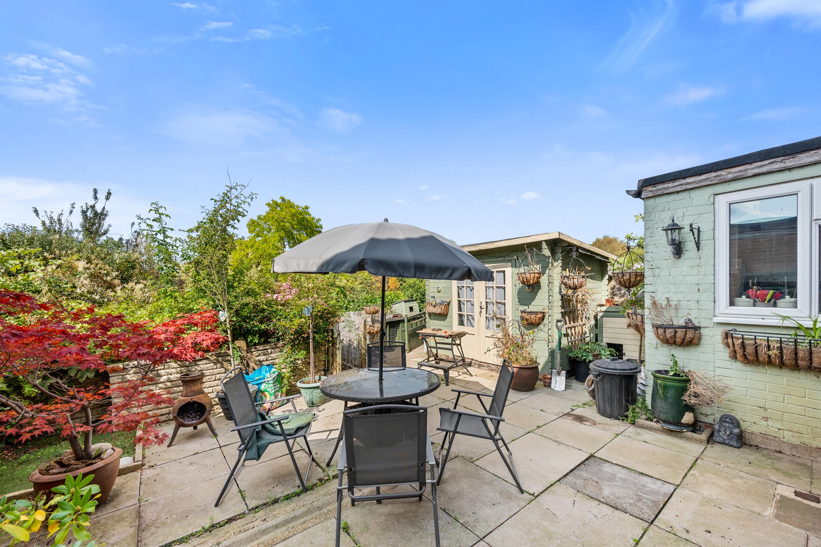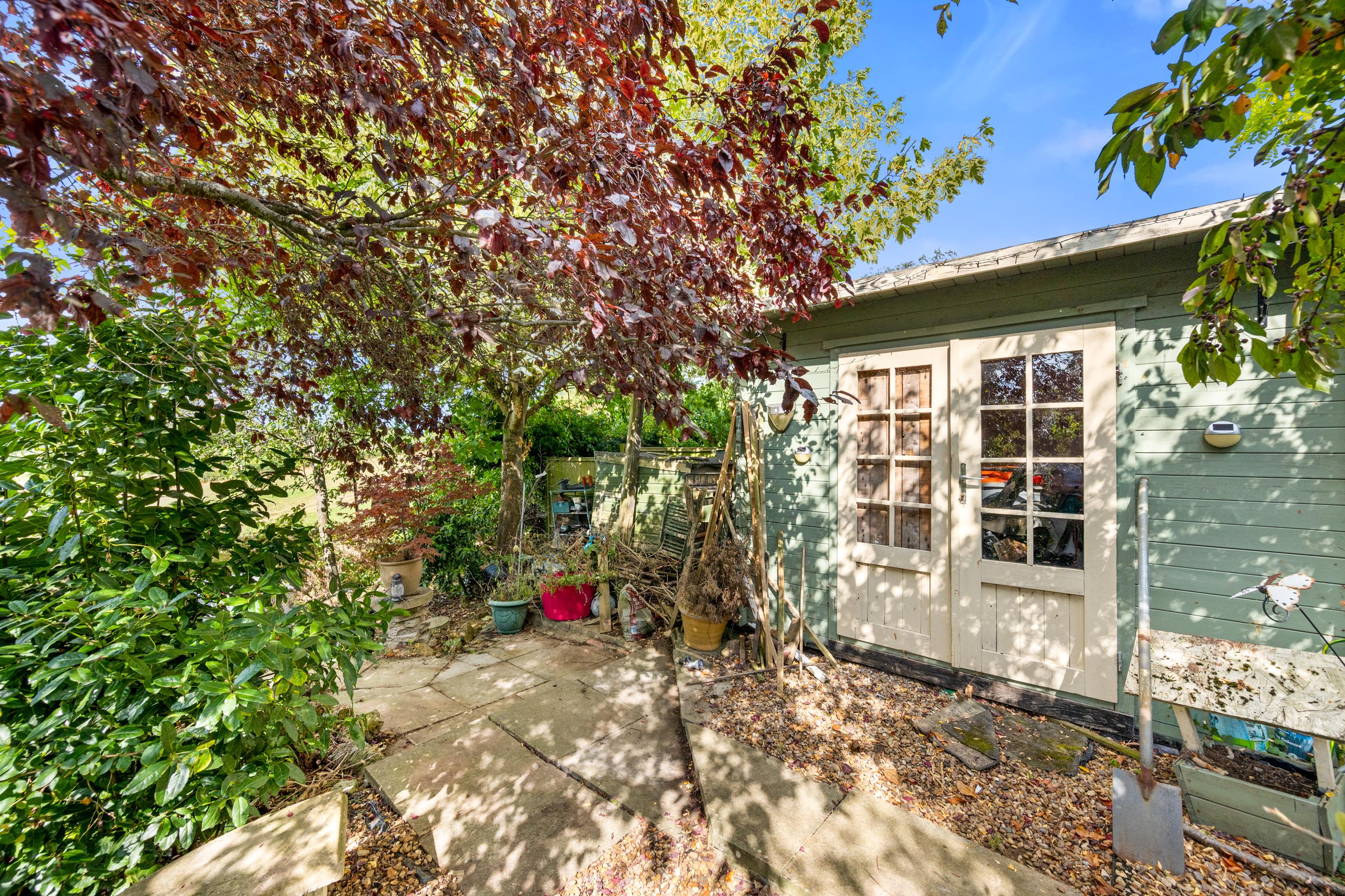 The rear garden offers the best of both worlds with a practical paved seating area perfect for entertaining, alongside a lawn area that provides an excellent degree of privacy for relaxation and family activities. Summerhouse with power connected. Fabulous seating area at the foot of the garden with views across open countryside.