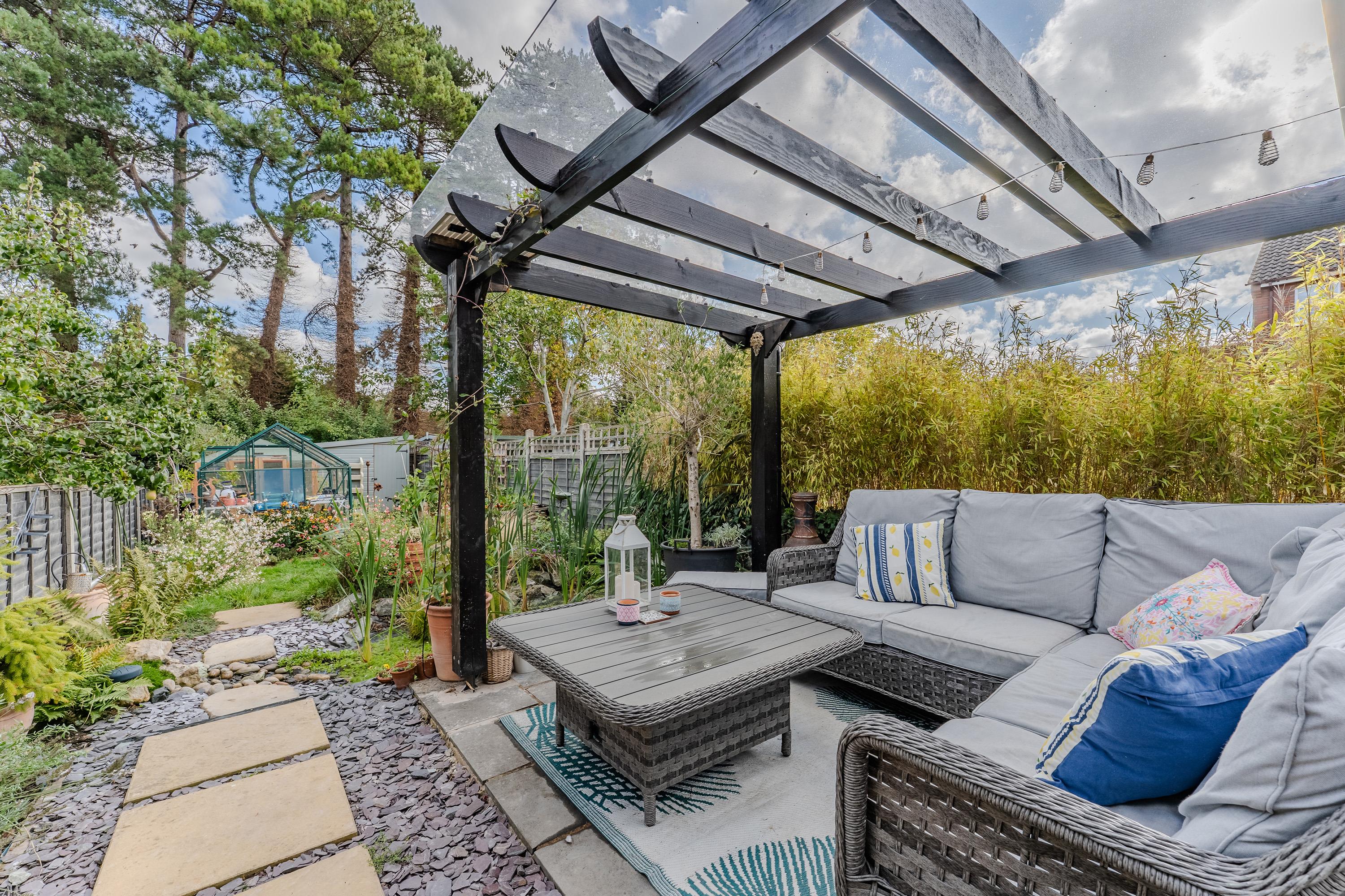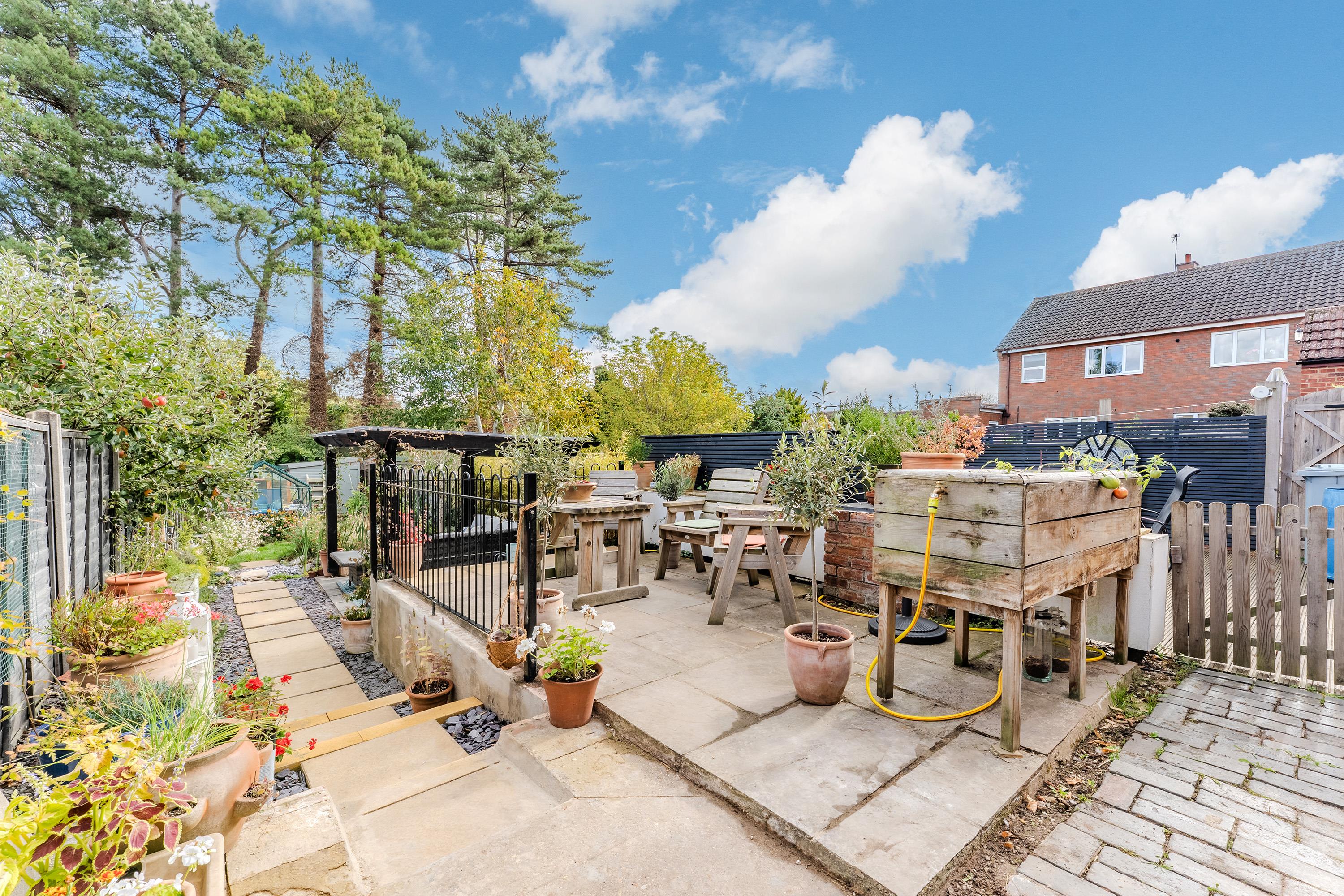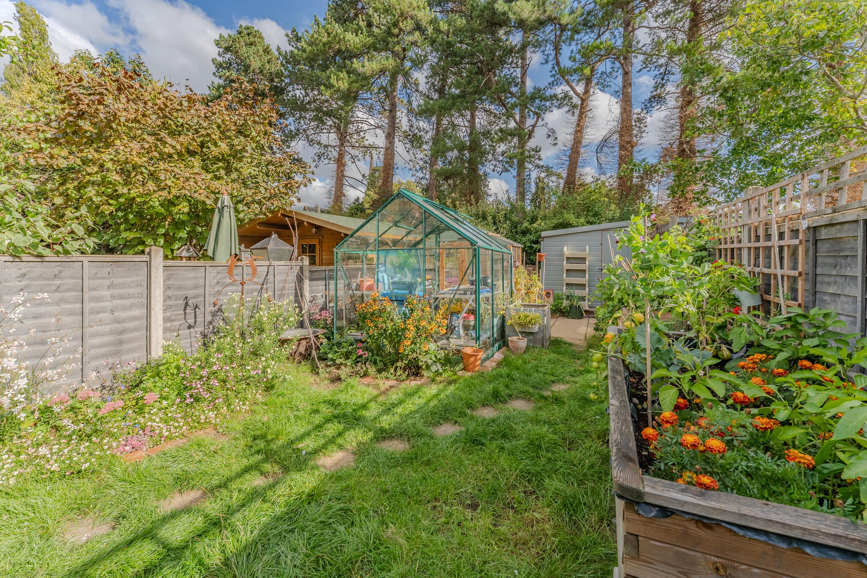 The rear garden is an impressive feature of this property: exceptionally large and well laid out with a patio and pergola, a generous lawn, and handy sheds at the far end. To the front, the property offers off-road parking for two vehicles.