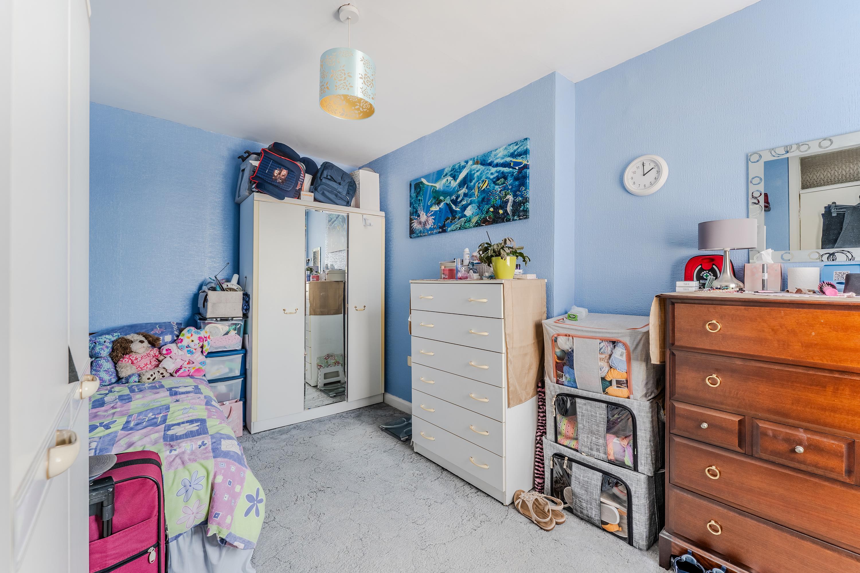 The first floor accommodation comprises three well-proportioned bedrooms alongside a contemporary white three-piece shower room, providing comfortable family living space.