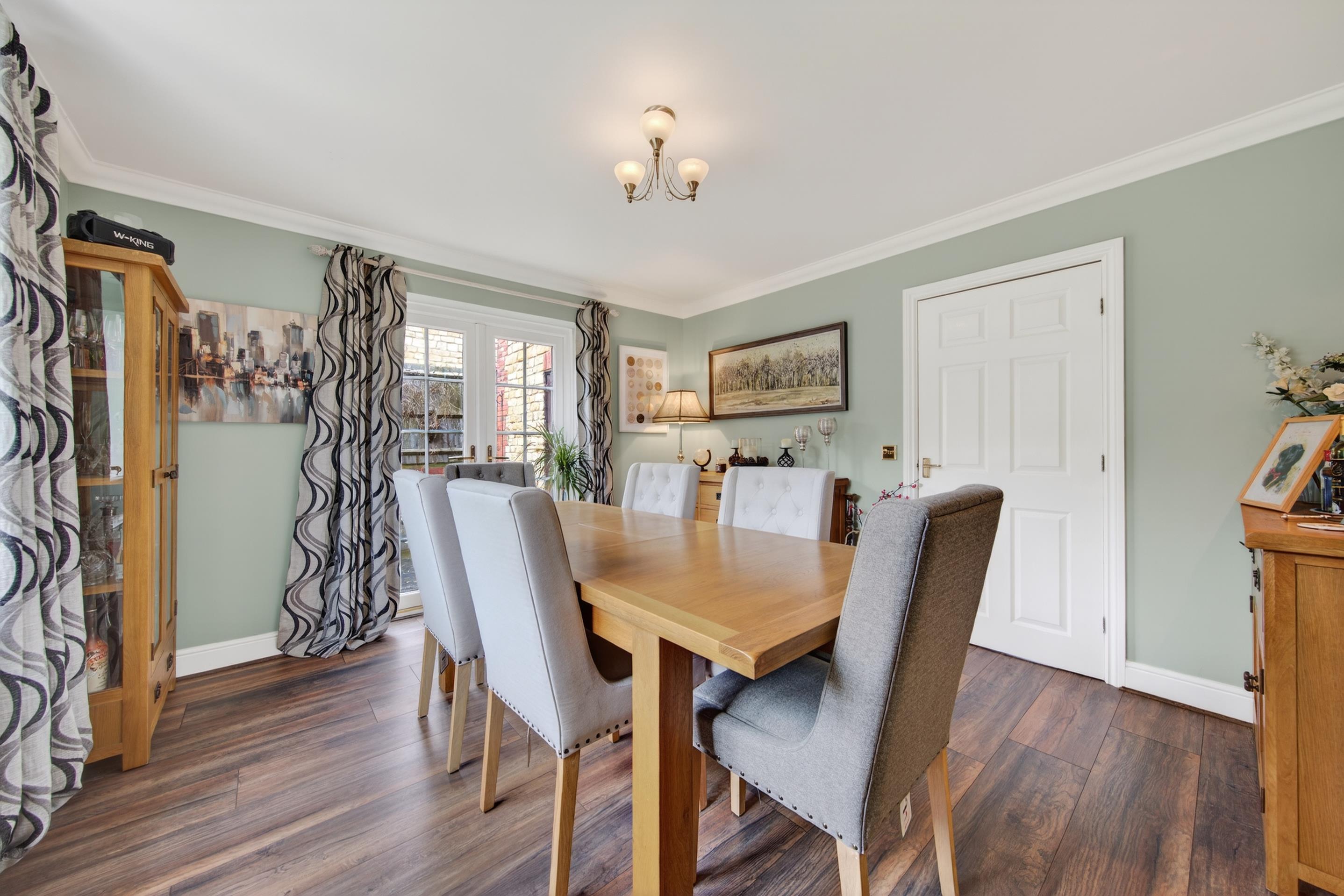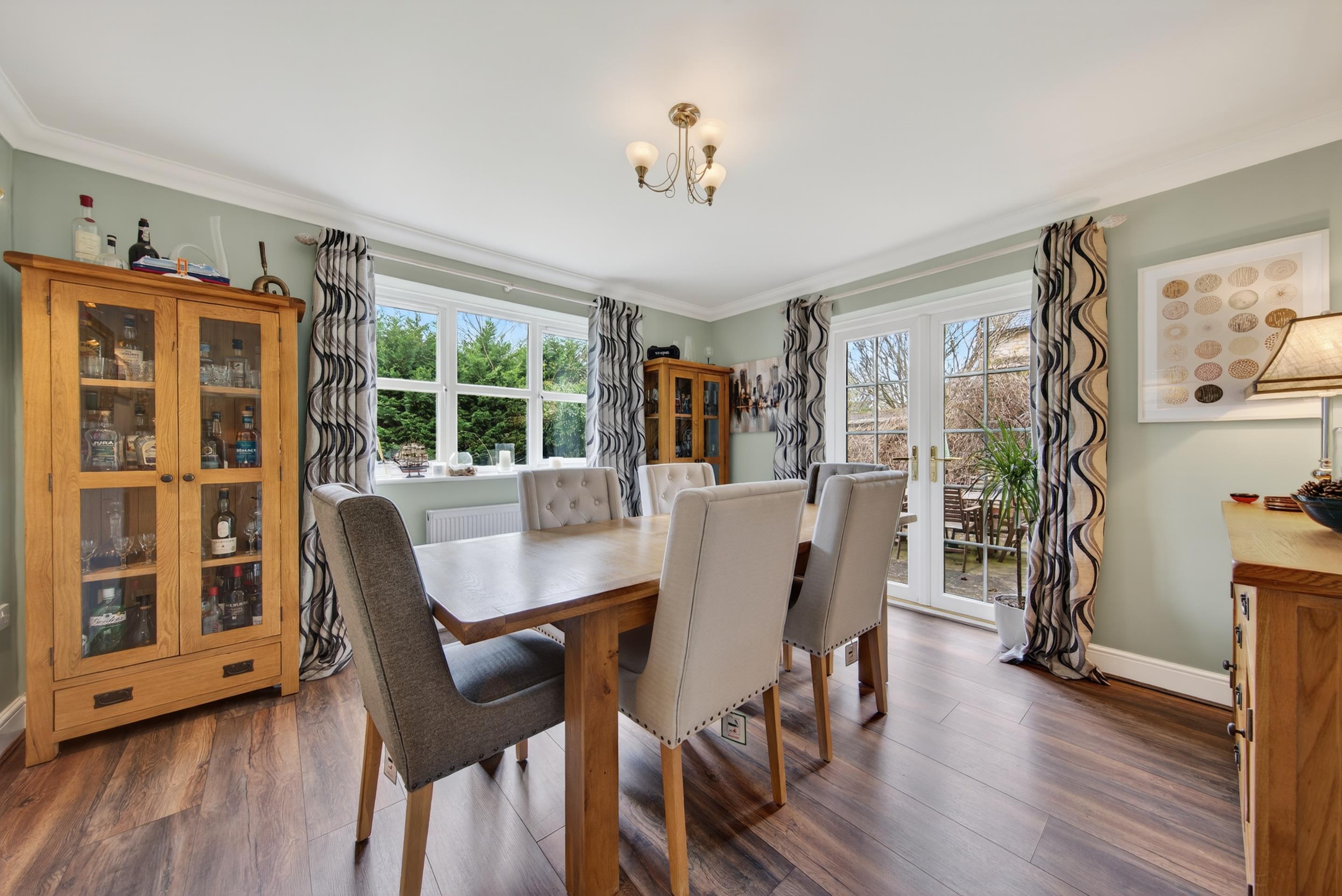 The property offers spacious and well-appointed accommodation throughout. Upon entering, you are greeted by a generous entrance hall that sets the tone for the rest of the home. The ground floor features a study ideal for home working, a modern fitted kitchen with breakfast area, and a separate utility room. The formal dining room enjoys doors opening directly onto the rear garden, creating an excellent space for entertaining, while the bright and comfortable living room also benefits from garden access. A convenient cloakroom/WC completes the ground floor accommodation. To the first floor, the property offers four well-proportioned double bedrooms. Two of the bedrooms benefit from their own en-suite shower rooms, while a stylish family bathroom serves the remaining bedrooms. Externally, the property truly comes into its own. The generous rear garden offers a good degree of privacy and is predominantly laid to lawn, complemented by established shrubs and planting. Decking and patio areas provide ideal spaces for outdoor dining and entertaining during the warmer months. To the front, a substantial driveway provides ample parking and leads to an oversized double garage. Properties of this quality and location are rarely available, and early viewing is highly recommended.